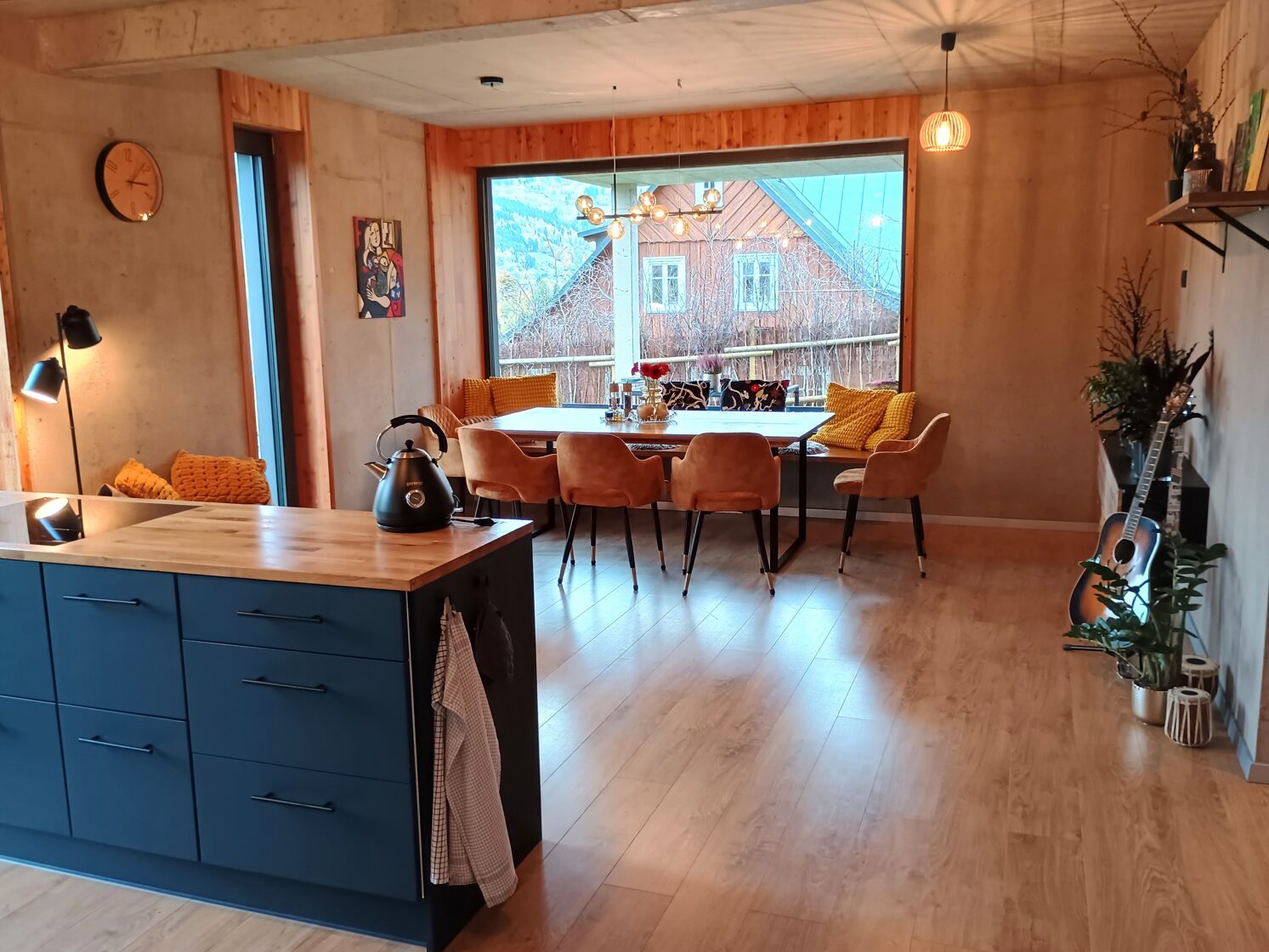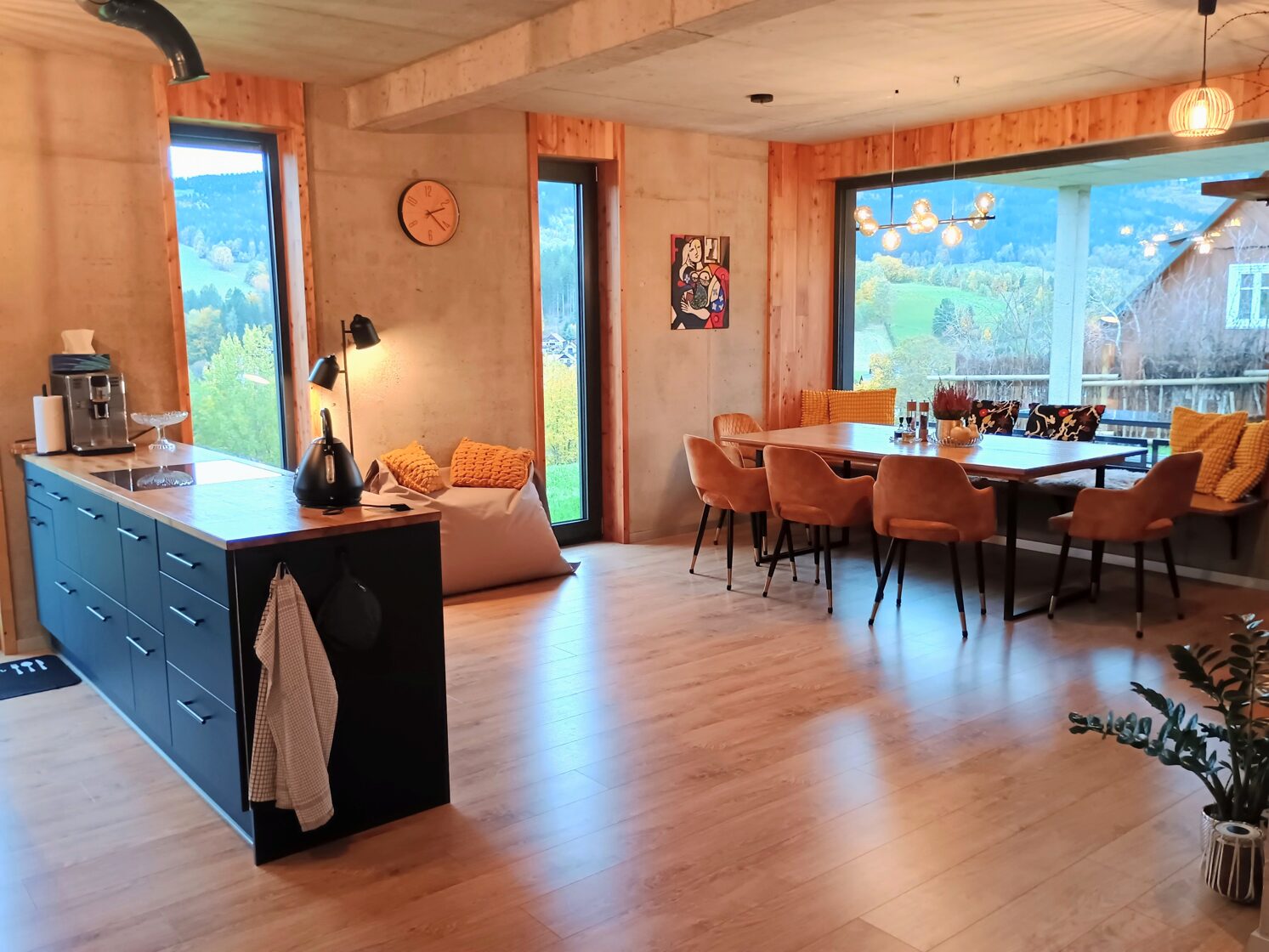 Velký jídelní stůl je ideální pro rodinné snídaně nebo večerní posezení s přáteli. K dispozici je plně vybavená kuchyň s indukční deskou, troubou, myčkou nádobí, kuchyňským robotem a kávovarem se zrnkovou kávou.