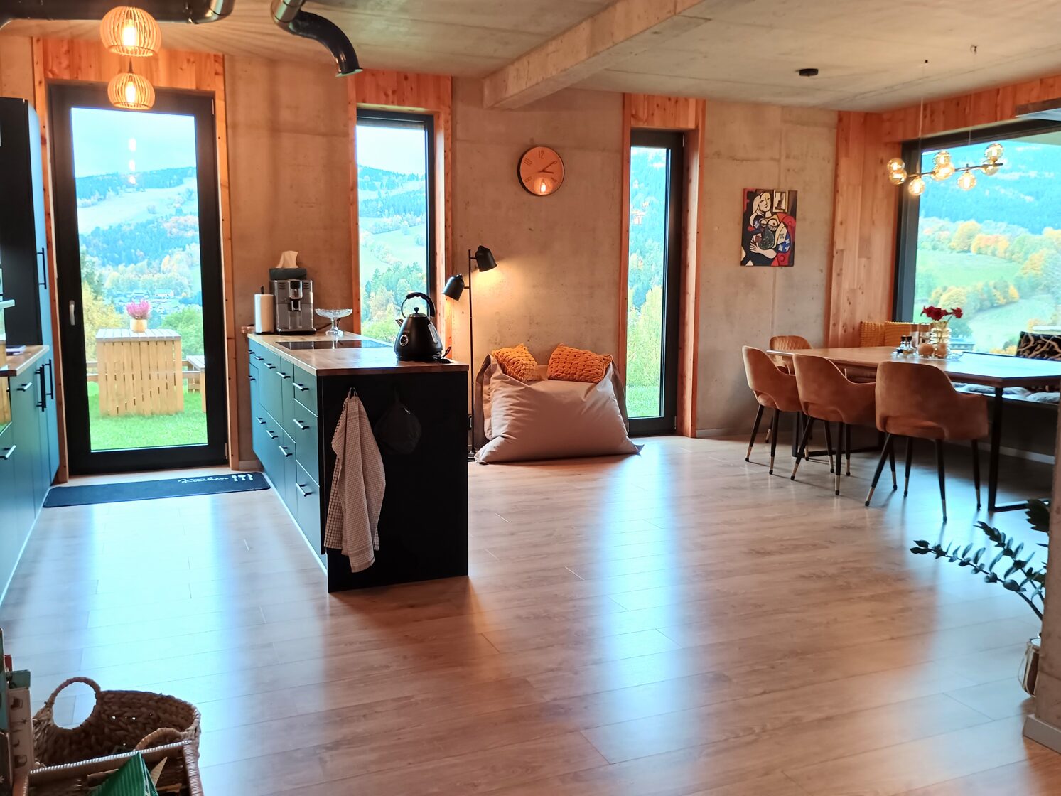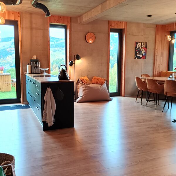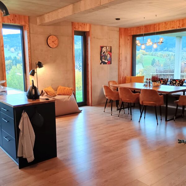 Zcela nový, prostorný a vzdušný chalet v klidné části Rokytnice nad Jizerou spojuje moderní design s přírodními materiály. Chalet nabízí tři samostatné dvoulůžkové ložnice s krásným výhledem na hory a jednu ložnici s prosklenými dveřmi, odkud můžete pozorovat okolí i hvězdnou oblohu přímo z postele. Tato ložnice však není od obývacího pokoje zcela oddělena dveřmi. Dominantou domu je světlý, obytný prostor s kuchyní a velkým jídelním stolem u panoramatického okna.