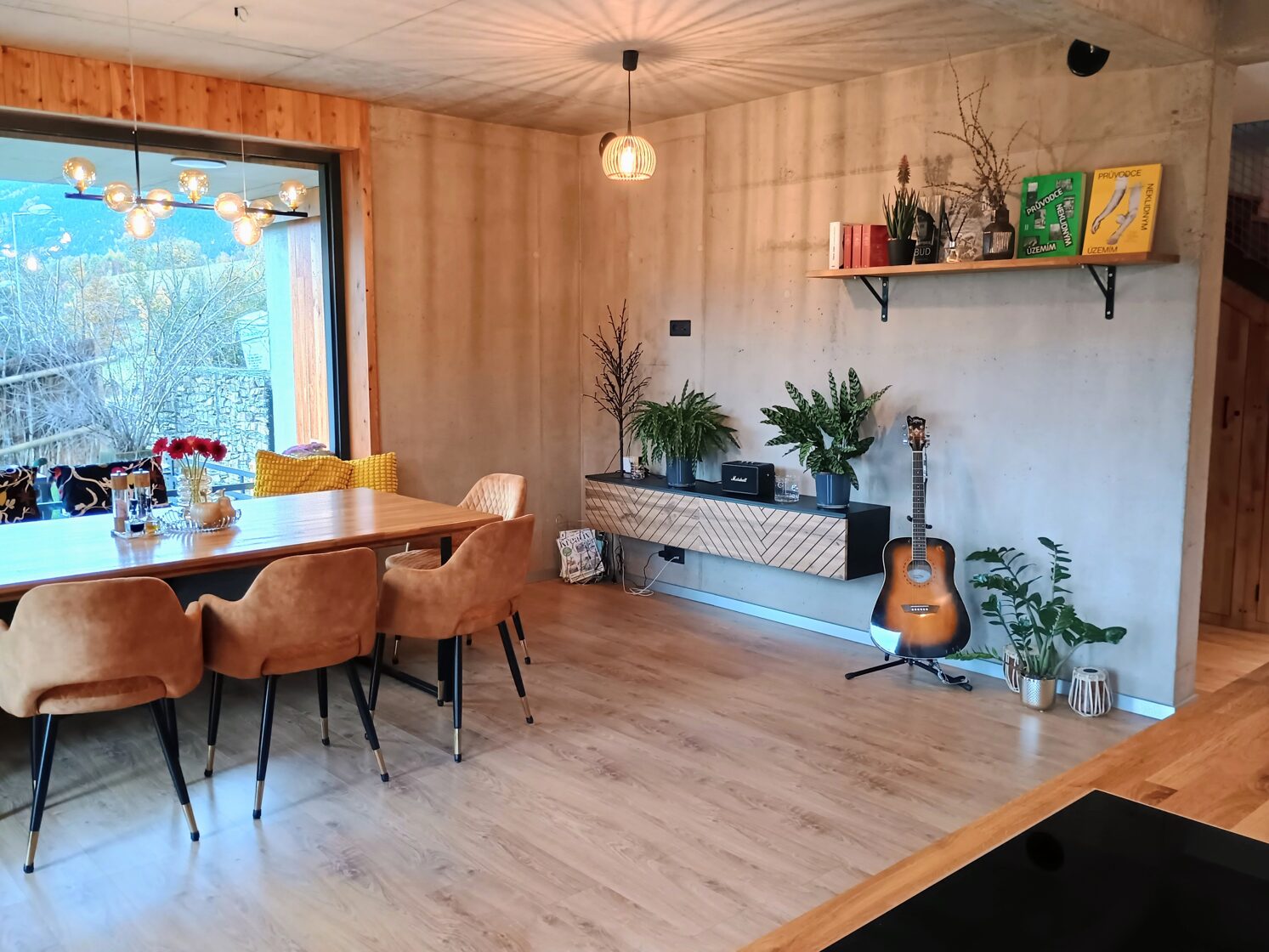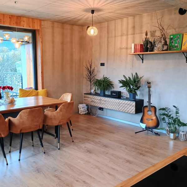Całą część dzienną dopełniają przytulne detale, takie jak książki czy gitara, które dopełniają przyjemną atmosferę. Nie szukaj telewizora w naszym domu, możesz umilić sobie czas grami planszowymi, książkami, grą na gitarze lub po prostu cieszyć się chwilami spokoju w gronie rodziny. Dzieci będą mogły bawić się klockami, zabawkami i książkami.