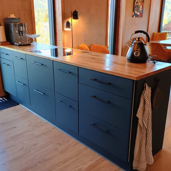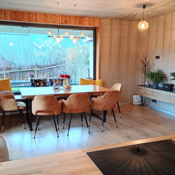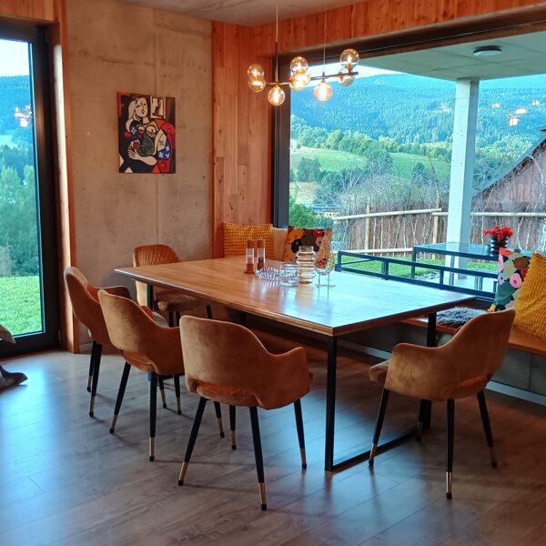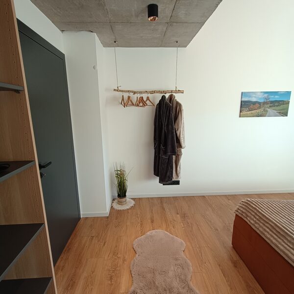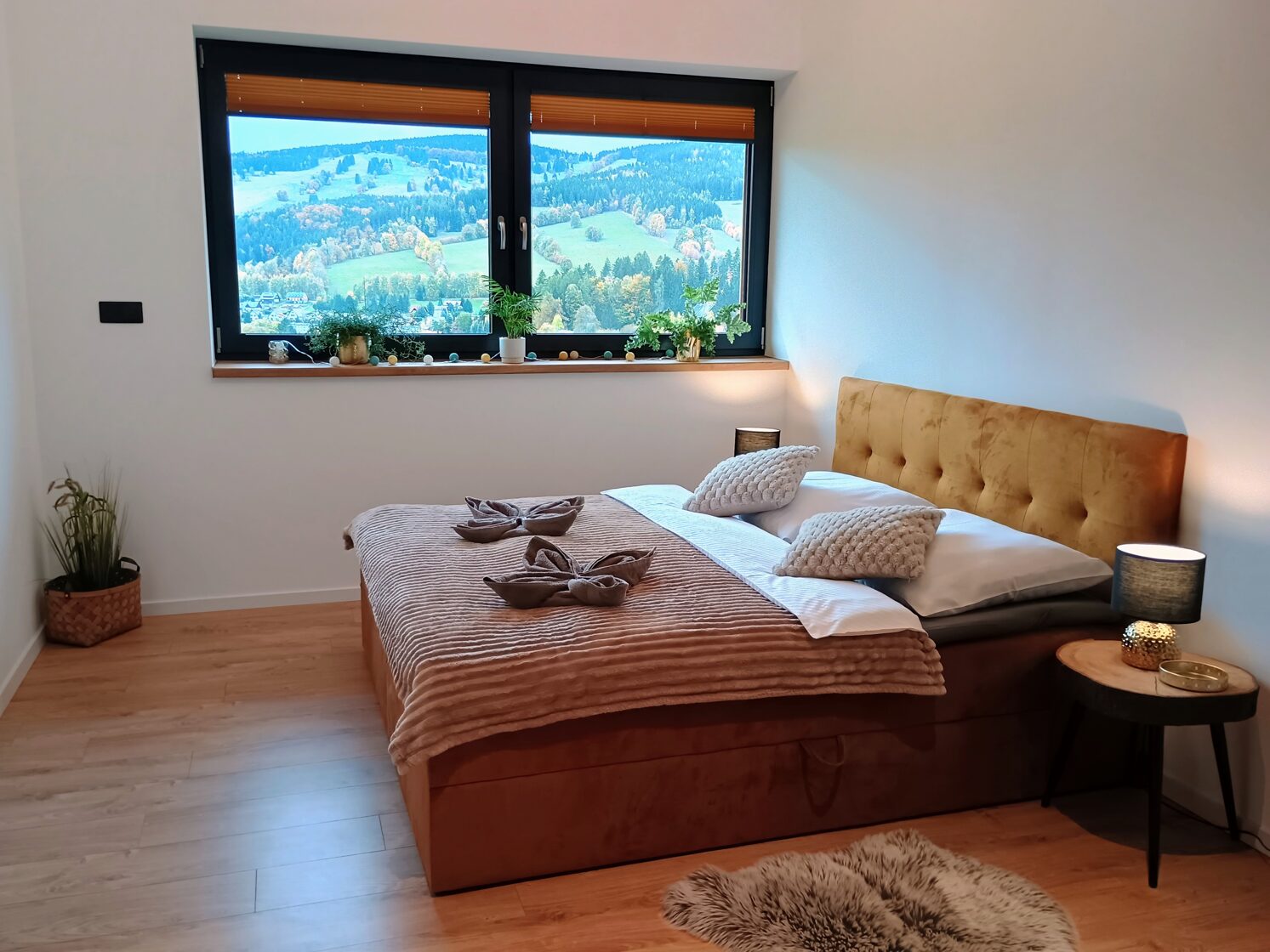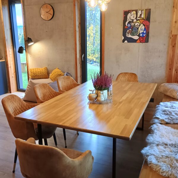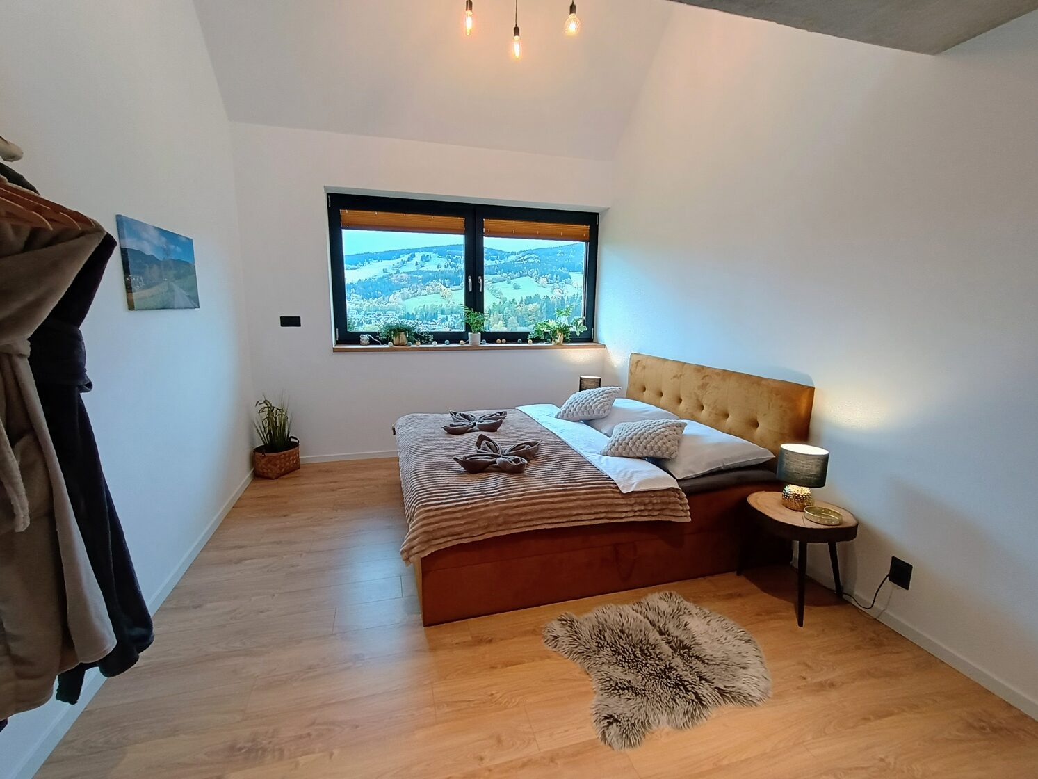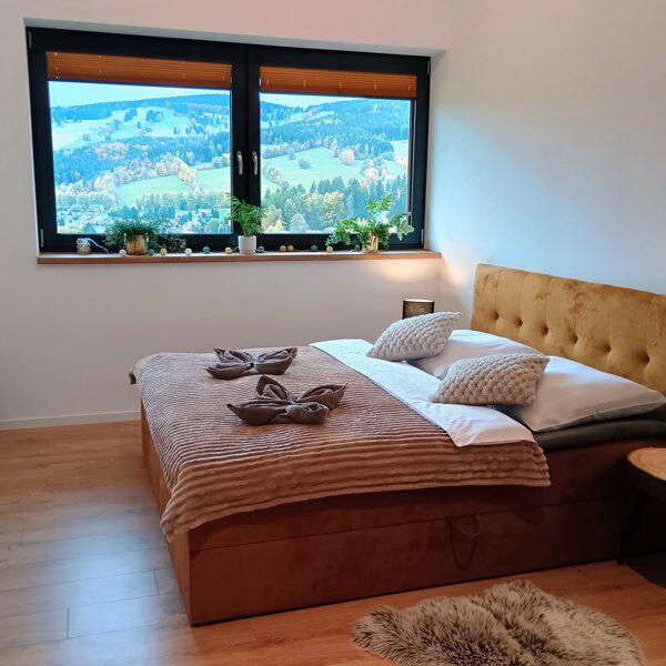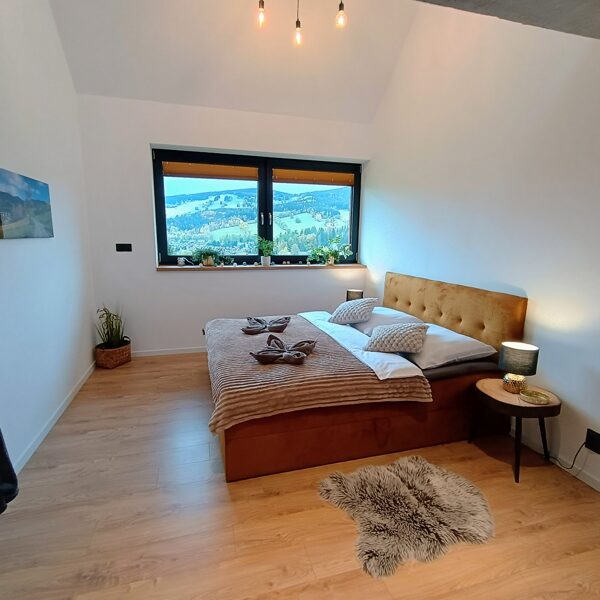 Całkowicie nowy, przestronny i jasny domek w spokojnej części Rokytnic nad Jizerou łączy nowoczesny design z naturalnymi materiałami. Domek oferuje trzy oddzielne dwuosobowe sypialnie z pięknym widokiem na góry oraz jedną sypialnię z przeszklonymi drzwiami, skąd można podziwiać okolicę i gwiaździste niebo prosto z łóżka. Ta sypialnia nie jest jednak całkowicie oddzielona drzwiami od salonu. Dominantą domu jest jasna część dzienna z kuchnią i dużym stołem jadalnianym przy panoramicznym oknie.