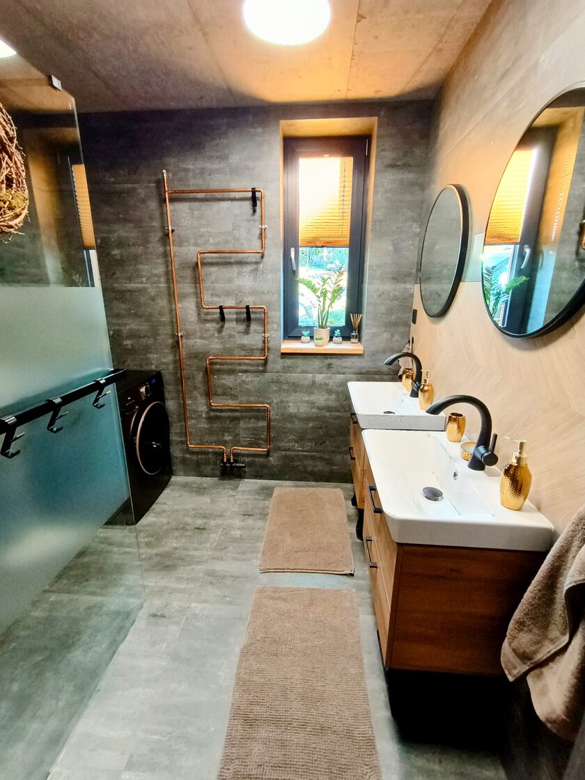 W domu znajdują się dwie nowoczesne łazienki, każda wyposażona w prysznic oraz trzy osobne toalety. Dla maksymalnego komfortu w jednej z łazienek dostępna jest także pralka i suszarka.
