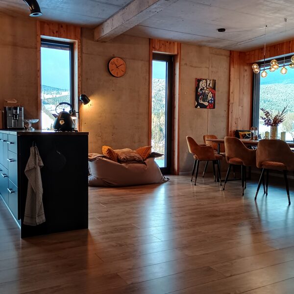 Ein brandneues, geräumiges und luftiges Chalet in einem ruhigen Teil von Rokytnice nad Jizerou verbindet modernes Design mit natürlichen Materialien. Das Chalet bietet drei separate Doppelzimmer mit wunderschönem Bergblick und ein Schlafzimmer mit Glastüren, das es Ihnen ermöglicht, die Umgebung und den Sternenhimmel direkt vom Bett aus zu beobachten. Dieses Schlafzimmer ist jedoch nicht vollständig durch eine Tür vom Wohnzimmer getrennt. Das Highlight des Hauses ist ein heller Wohnbereich mit einer Küche und einem großen Esstisch am Panoramafenster.